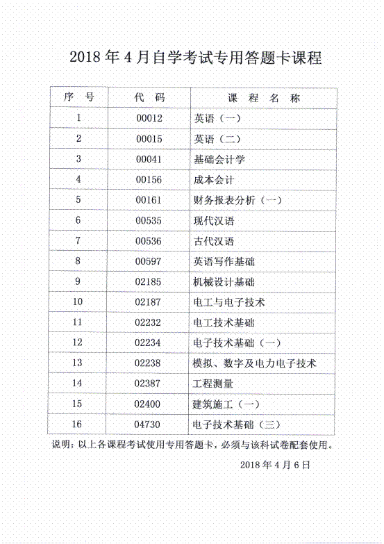 2018年4月自學(xué)考試傳統(tǒng)卷課程、專用答題卡課程信息
